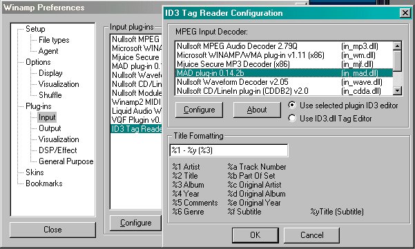 The plugin provides the same ID3 support in Winamp, regardless of the MPEG decoder input plugin in use. (Nitrane doesn't read ID3v2.4 tags, MAD doesn't read ID3v2 tags at all).